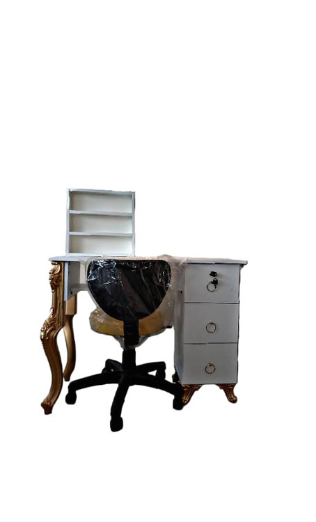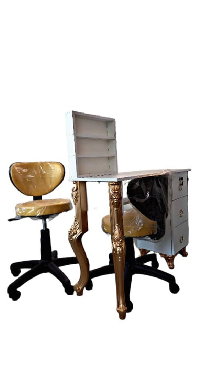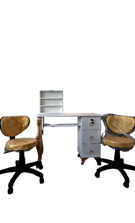 ست کامل میز ناخن کاری شامل یک عدد میز ناخن با استند رومیزی دو عدد صندلی جکدار برای مشتری و ناخن کار ین ست رو شما میتونید در سه رنگ متنوع سفید مشکی و طلایی سفارش بدید